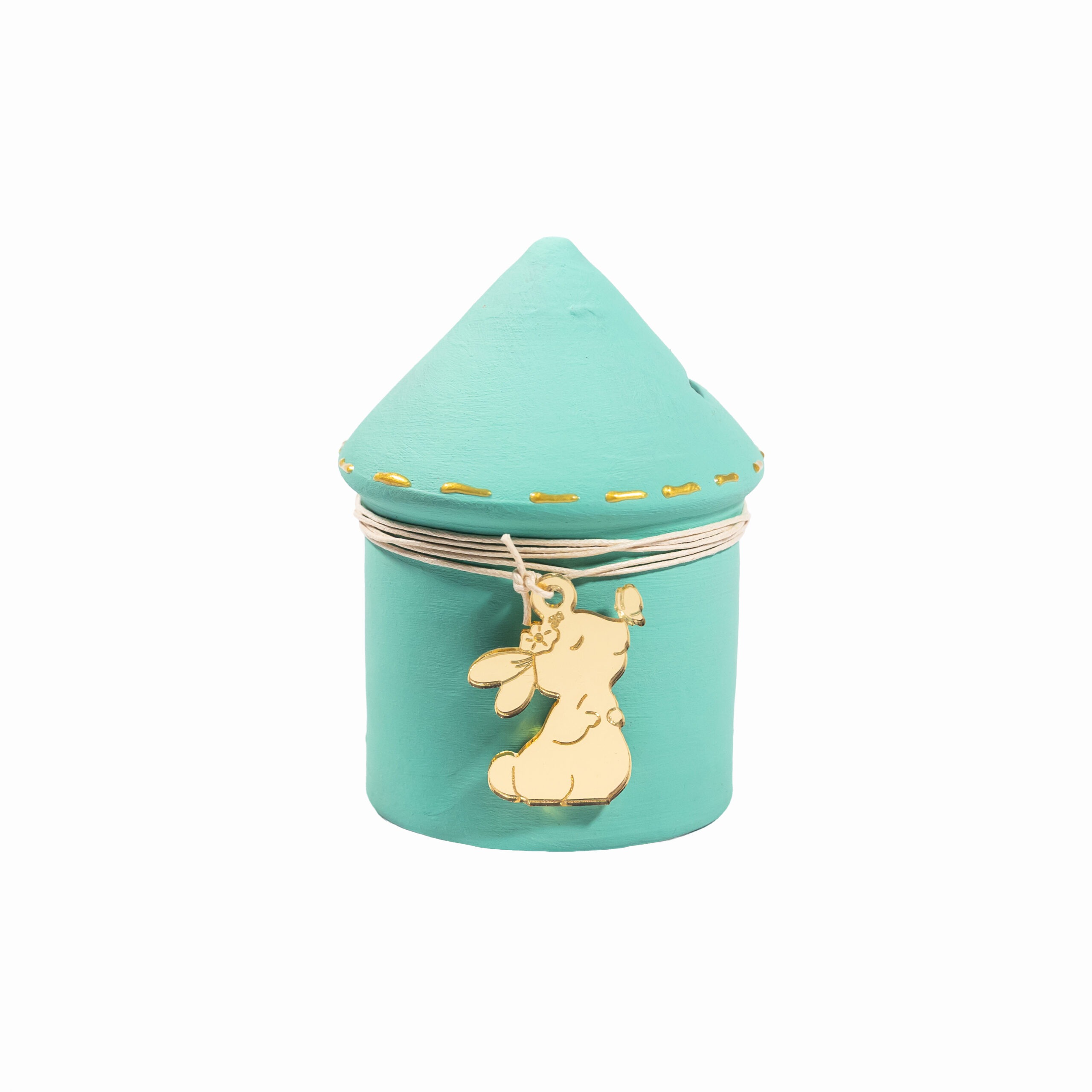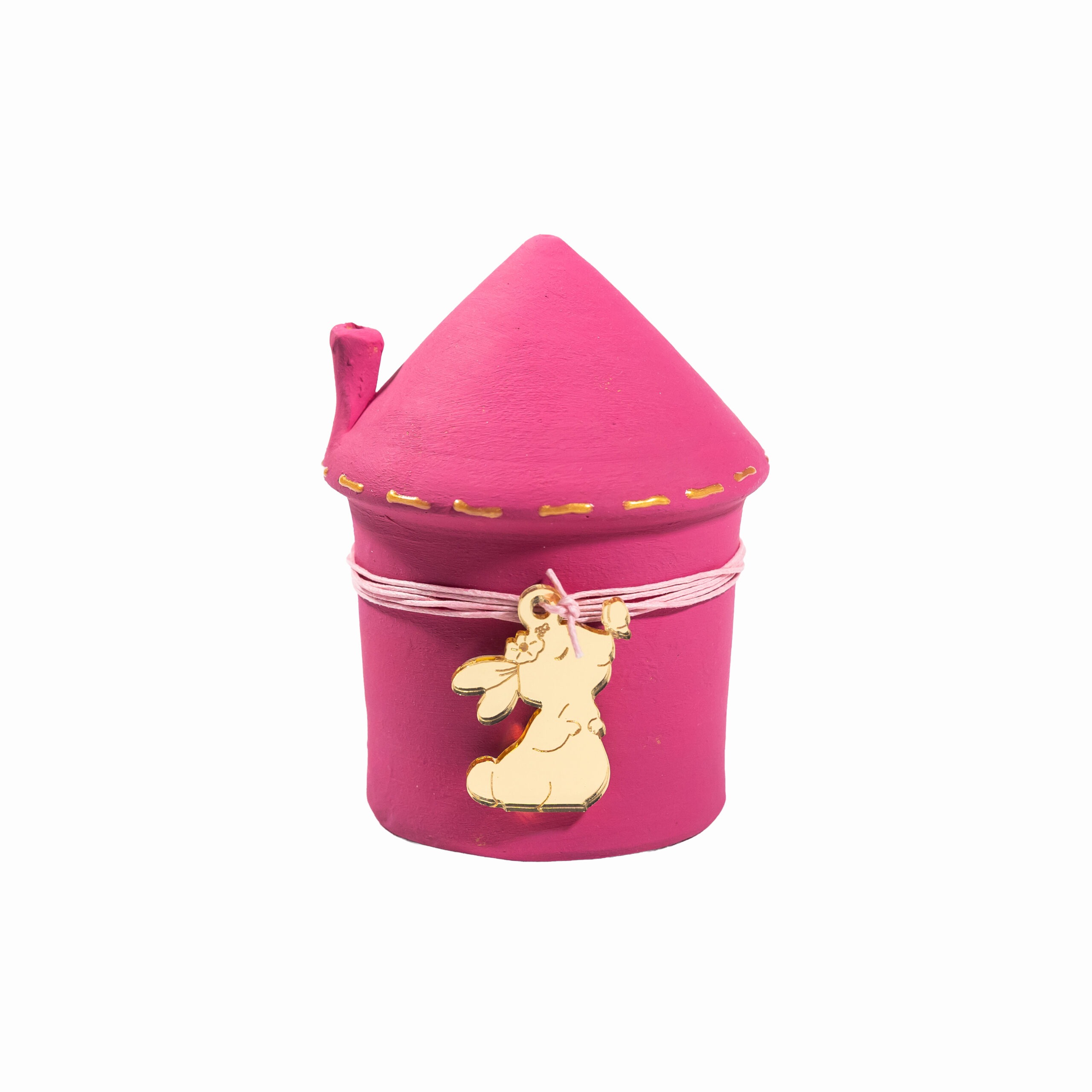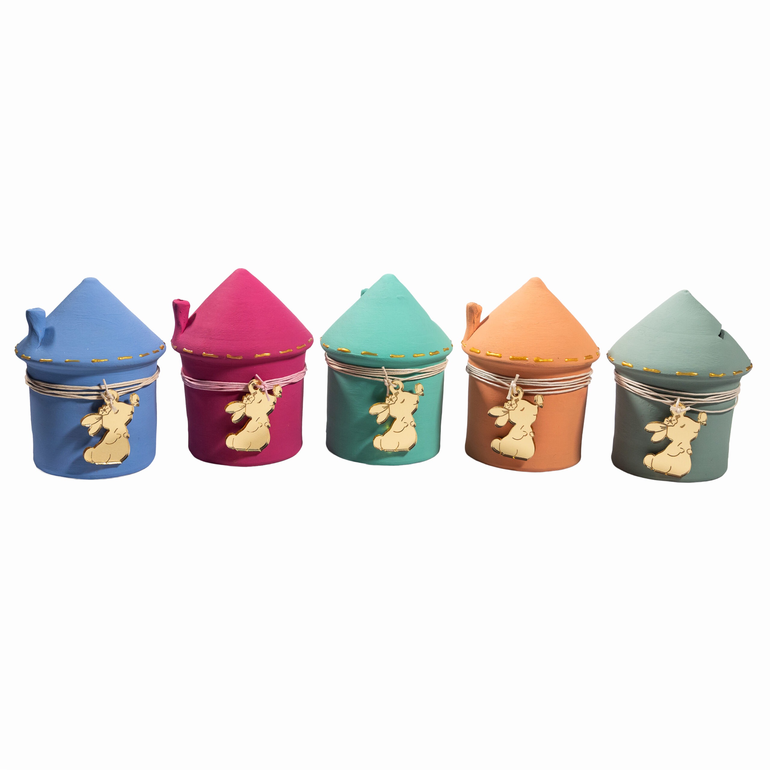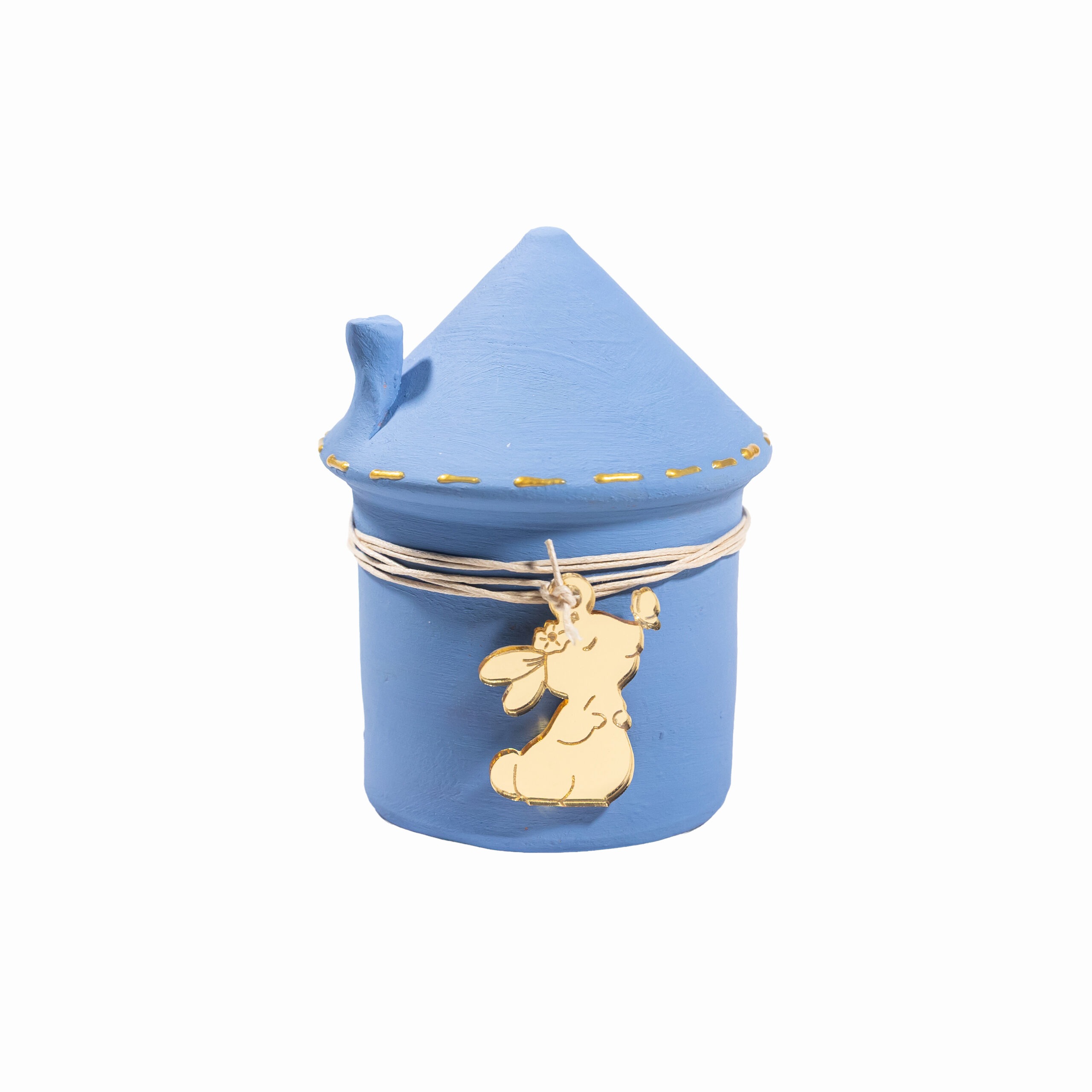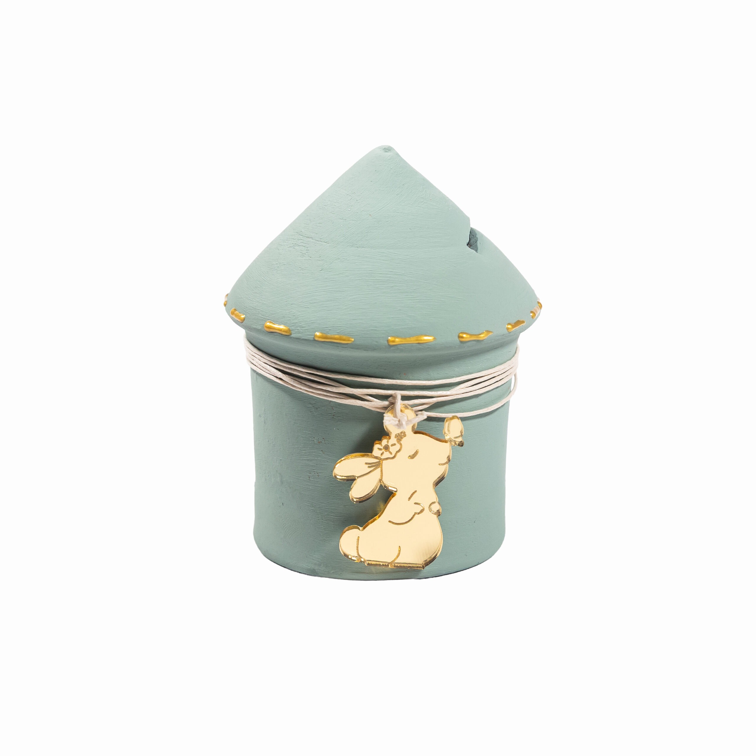 Κεραμικός κουμπαράς σε σχήμα σπιτιού, βαμμένος χειροποίητα με ακρυλικά χρώματα σε υπέροχες παστέλ αποχρώσεις. Διαθέτει πώμα και διακοσμείται με ένα bunny διακοσμητικό από χρυσό plexiglass, το οποίο κρέμεται από ένα σκοινάκι σε ταιριαστό χρώμα