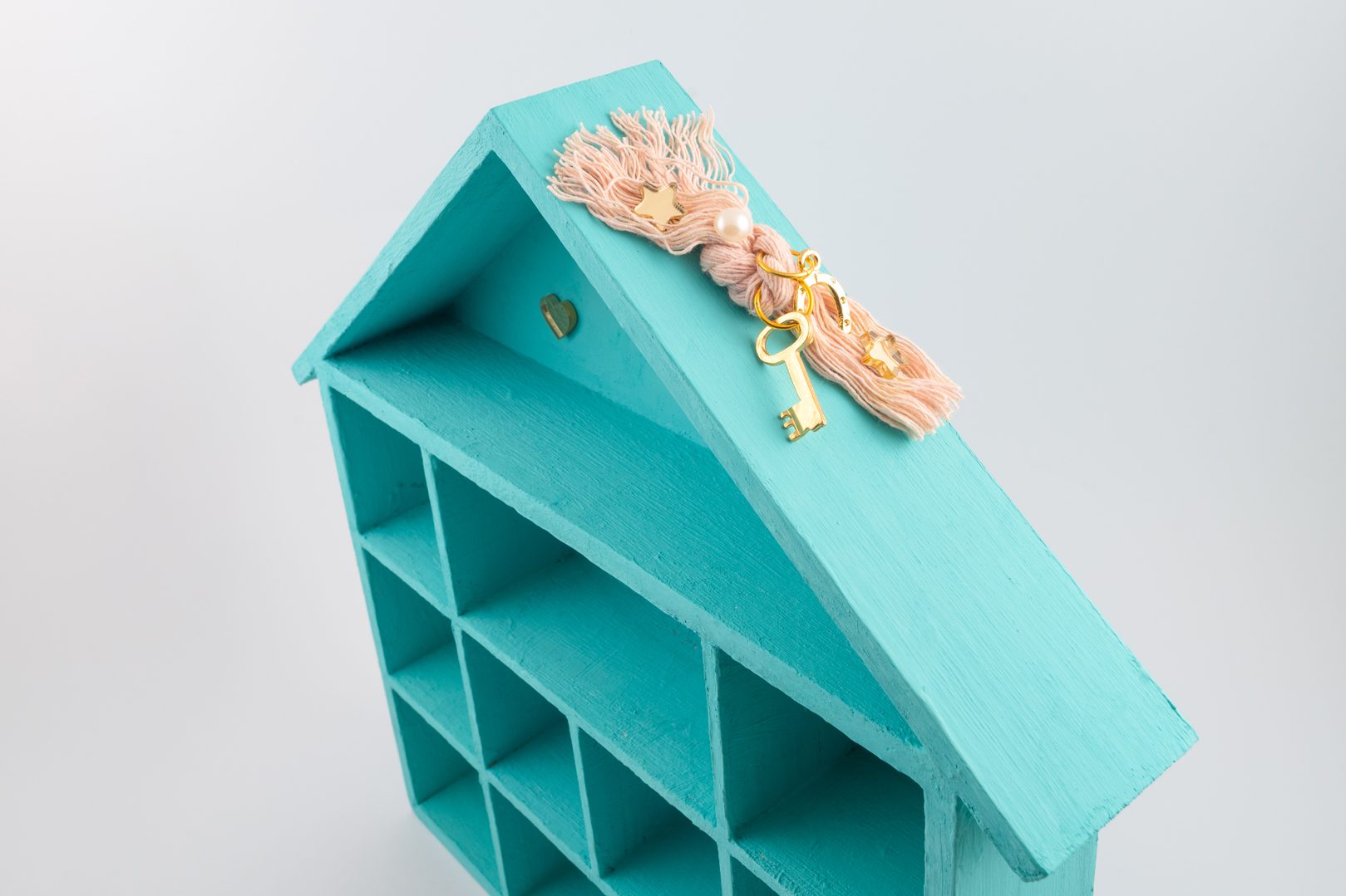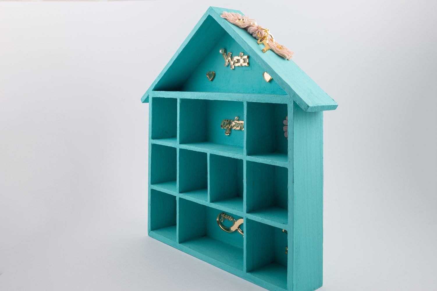 Διακοσμείται με ευχές από χρυσό plexiglass όπως “υγεία, αγάπη, τύχη” και από το σύμβολο άπειρο που γράφει you and me. Επιπλέον διακοσμείται από υφασμάτινα λουλουδάκια, πέρλες, αστεράκια και καρδούλες από χρυσό plexiglass. Στην σκεπή του επάνω έχει σε βαμβακερό κορδόνι σε ροζ απόχρωση ένα κλειδάκι και ένα πέταλο για γούρι