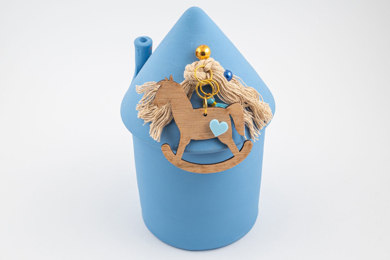 Είναι διακοσμημένος από βαμβακερό κορδόνι χοντρό σε neutral χρώμα, ξύλινο κουνιστό αλογάκι με μια σιέλ καρδούλα από ματ plexiglass, σιέλ φούντα, πέρλα και χρυσή χάντρα