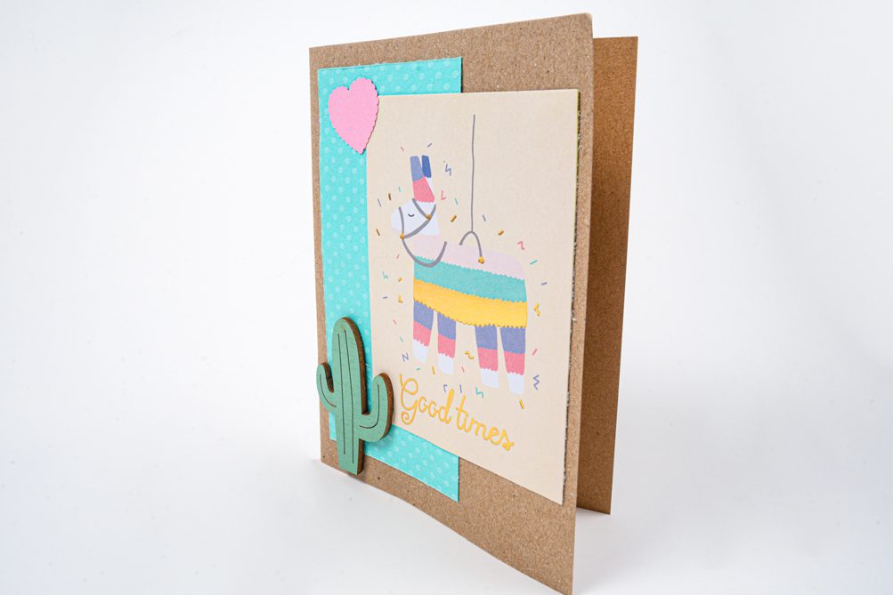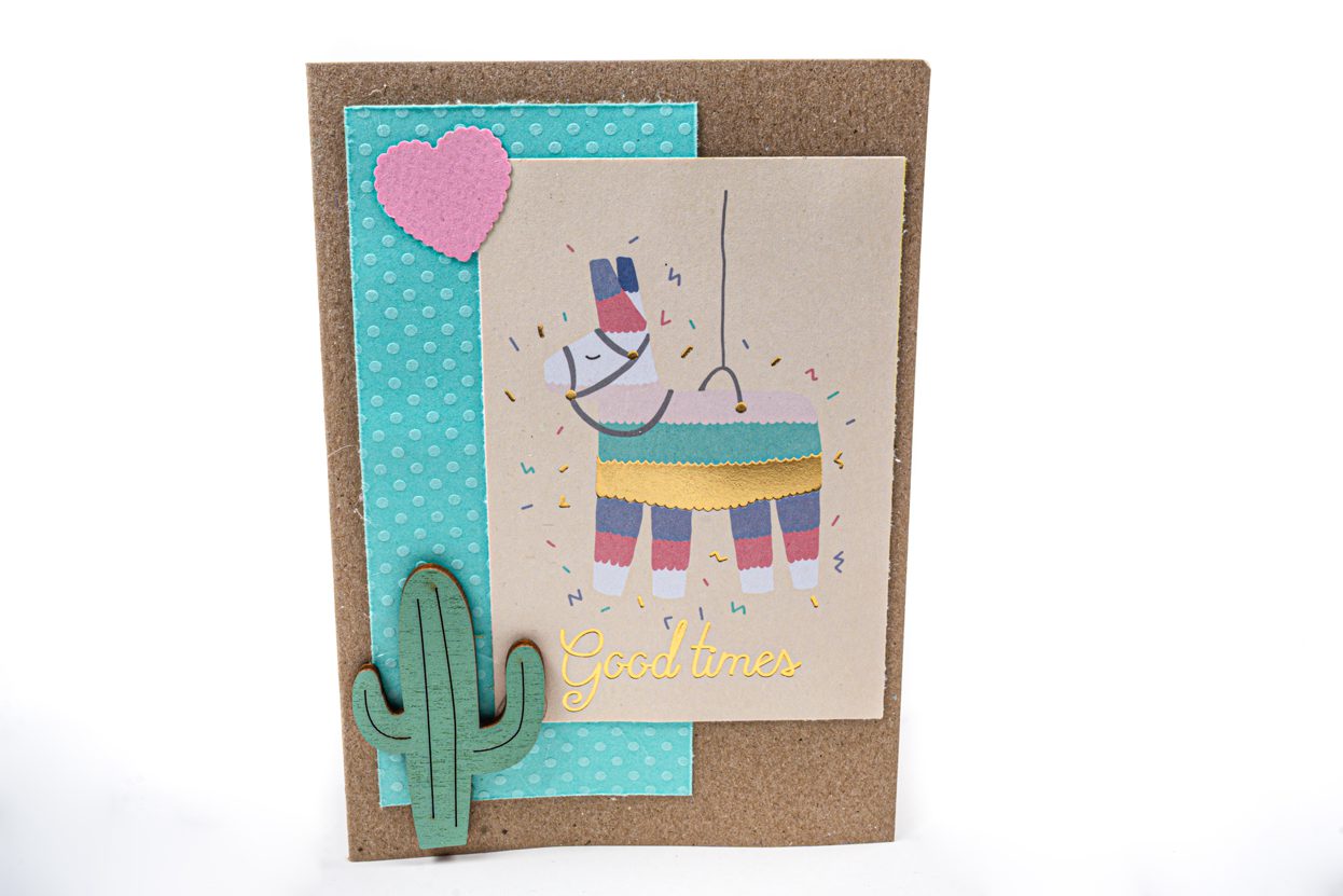 Εσωτερικά είναι κενή για να γράψετε τις δικές σας μοναδικές ευχές. Εξωτερικά είναι διακοσμημένη με βεραμάν πουά χαρτόνι scrapbooking, με ροζ χάρτινη καρδούλα κομμένη με ειδικό περφορατέρ, ξύλινο κάκτο σε πράσινη απόχρωση και ένα χαρούμενο χάρτινο μοτίβο με λάμα που γράφει “Good times”