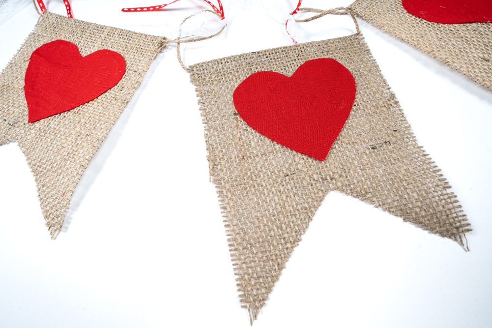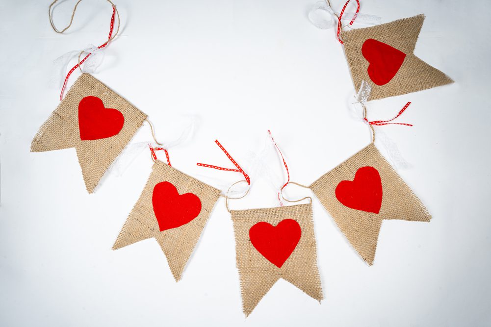 Μια ξεχωριστή γιρλάντα με 5 σημαιάκια από λινάτσα που ξεφτίζει, δίνοντας έτσι την vintage αίσθηση του “παλιακού” όπου πάνω τους είναι τοποθετημένες υφασμάτινες καρδούλες σε κόκκινο χρώμα. Ανάμεσα στα σημαιάκια κρέμονται κόκκινες κορδέλες και κορδέλες από δαντέλα και η γιρλάντα είναι όλη δεμένη με φυσικό σπάγγο