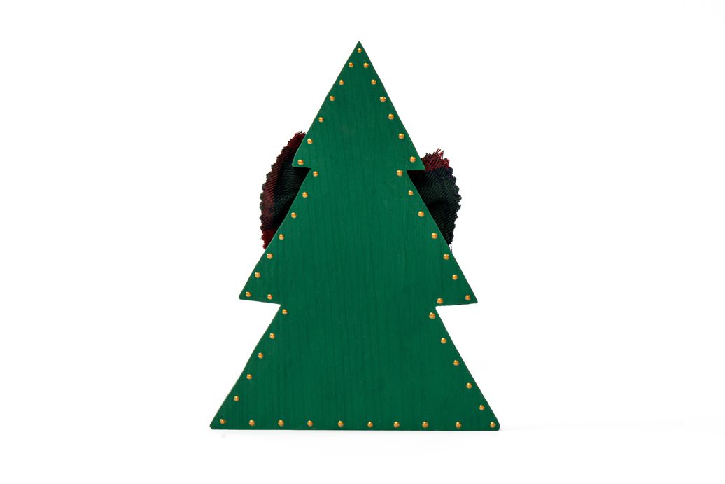 Χριστουγεννιάτικο ξύλινο δεντράκι βαμμένο σε πράσινες χριστουγεννιάτικες αποχρώσεις με φιογκάκι στο κέντρο από καρώ ύφασμα στην μπροστινή όψη