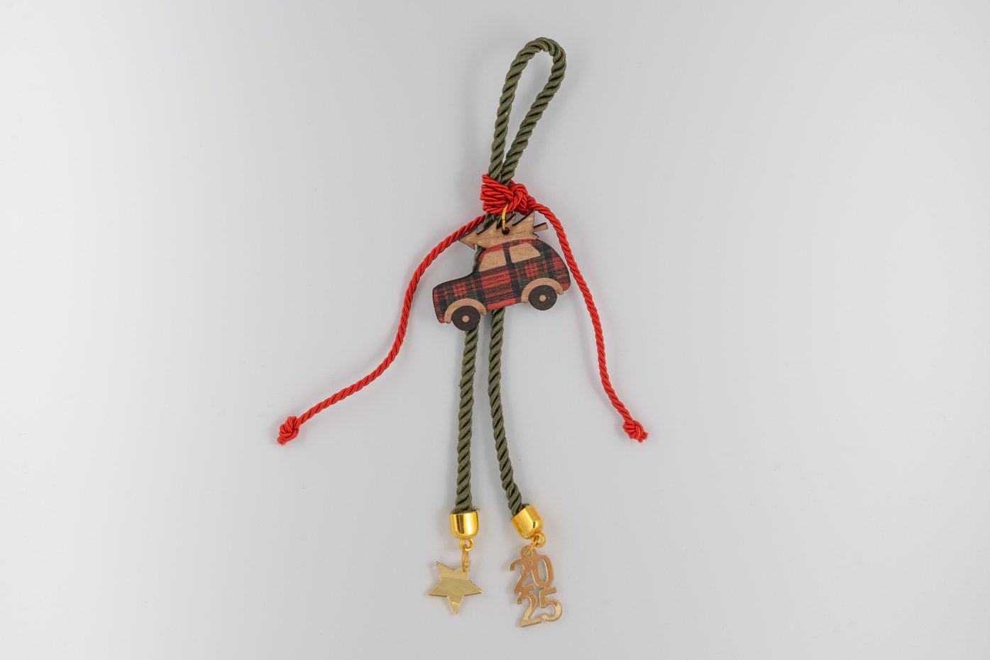 Ένα όμορφο γουράκι με το γραφικό αυτοκίνητο των Χριστουγέννων σε καρό εκδοχή. Το ξύλινο αυτοκινητάκι είναι περασμένο πάνω σε βαμβακερό κορδόνι σε λαδί απόχρωση με χρυσά τελειώματα