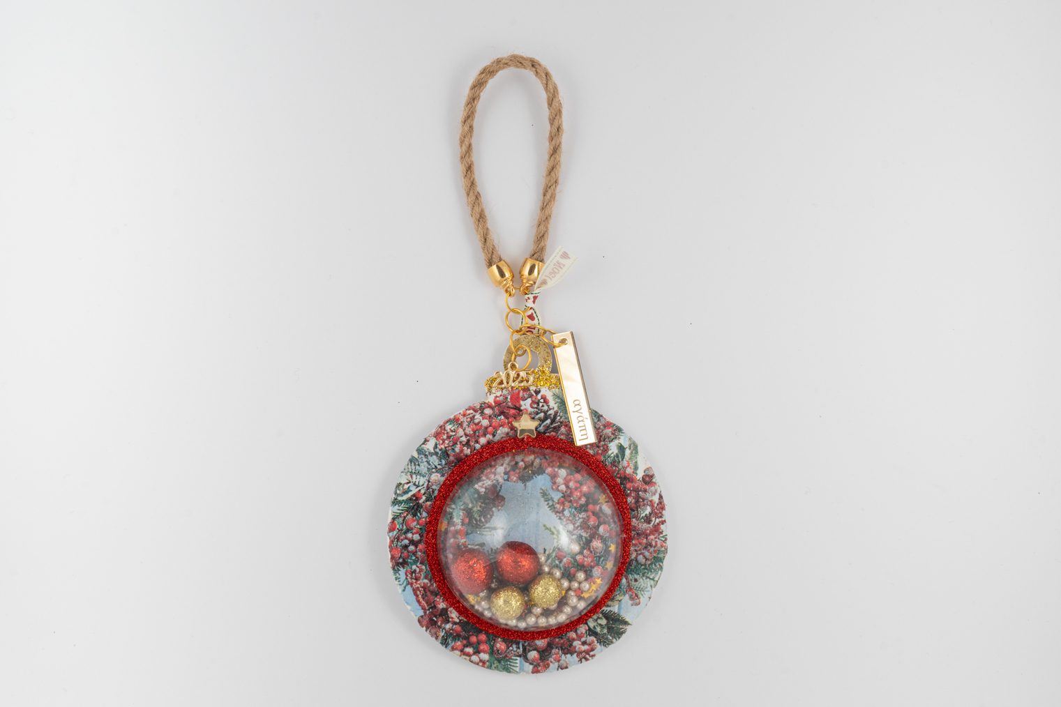 Χειροποίητη λευκή ξύλινη μπάλα όπου έχει εφαρμοστεί χριστουγεννιάτικο μοτίβο με την τεχνική του decoupage και από πάνω έχει επικολληθεί διάφανη μισή μπάλα plexiglass. Στο εσωτερικό της υπάρχουν διάφορα μεγέθη από μπαλάκια φελιζόλ με glitter καθώς και κομφετί αστεράκια. Γύρω από την μπάλα υπάρχει κόκκινη μεταλιζέ κορδέλα
