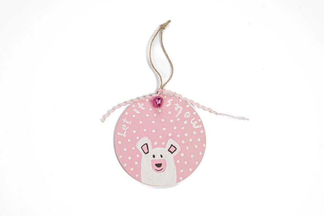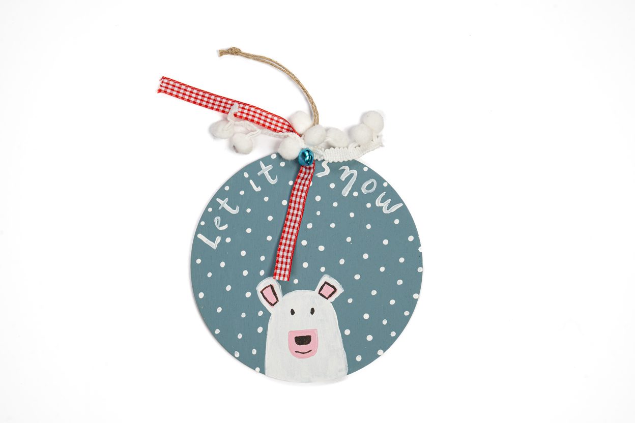 Ξύλινο στολίδι χειροποίητα ζωγραφισμένο με ακρυλικα χρώματα. Φέρει την επιγραφή Let it snow, η οποία έχει ιριδίζον γκλιτερ.
