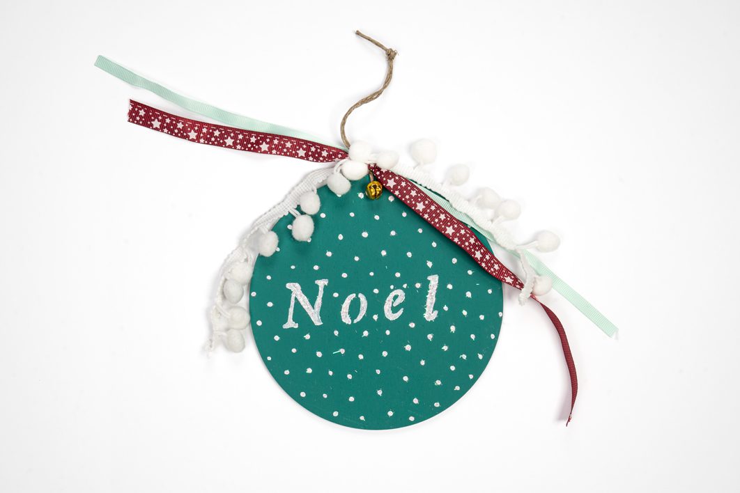 Ξύλινο στολίδι χειροποίητα ζωγραφισμένο με ακρυλικά χρώματα σε πετρολ χρώμα . Φέρει την επιγραφή Noël που στα γαλλικά σημαίνει Χριστούγεννα η οποία έχει ιριδίζον γκλίτερ