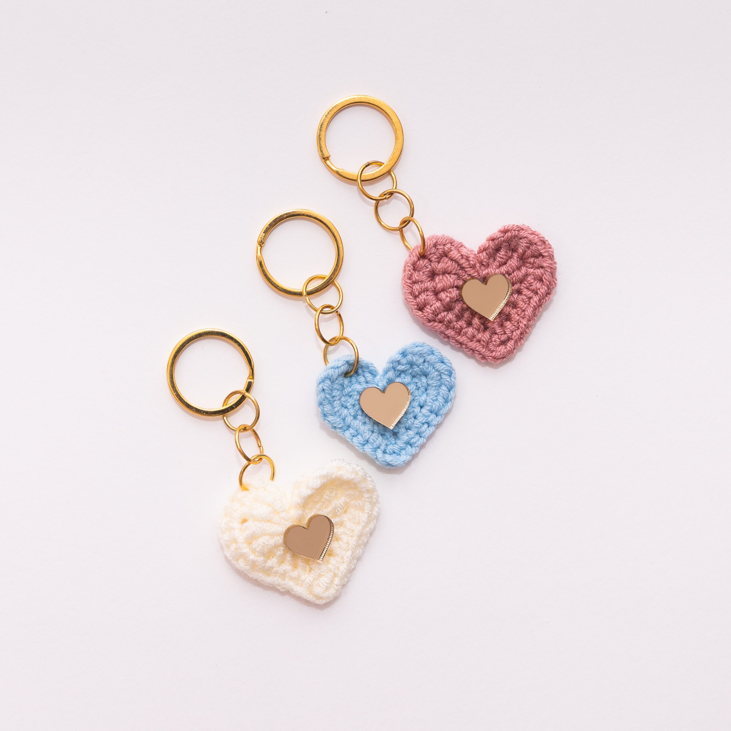 Η πλεκτή καρδιά από απαλή κλωστή crochet διακοσμείται με μίνι καρδούλα από χρυσό plexiglass και κρέμεται από αλυσίδα με κρικάκια και από ένα χρυσό κρίκο