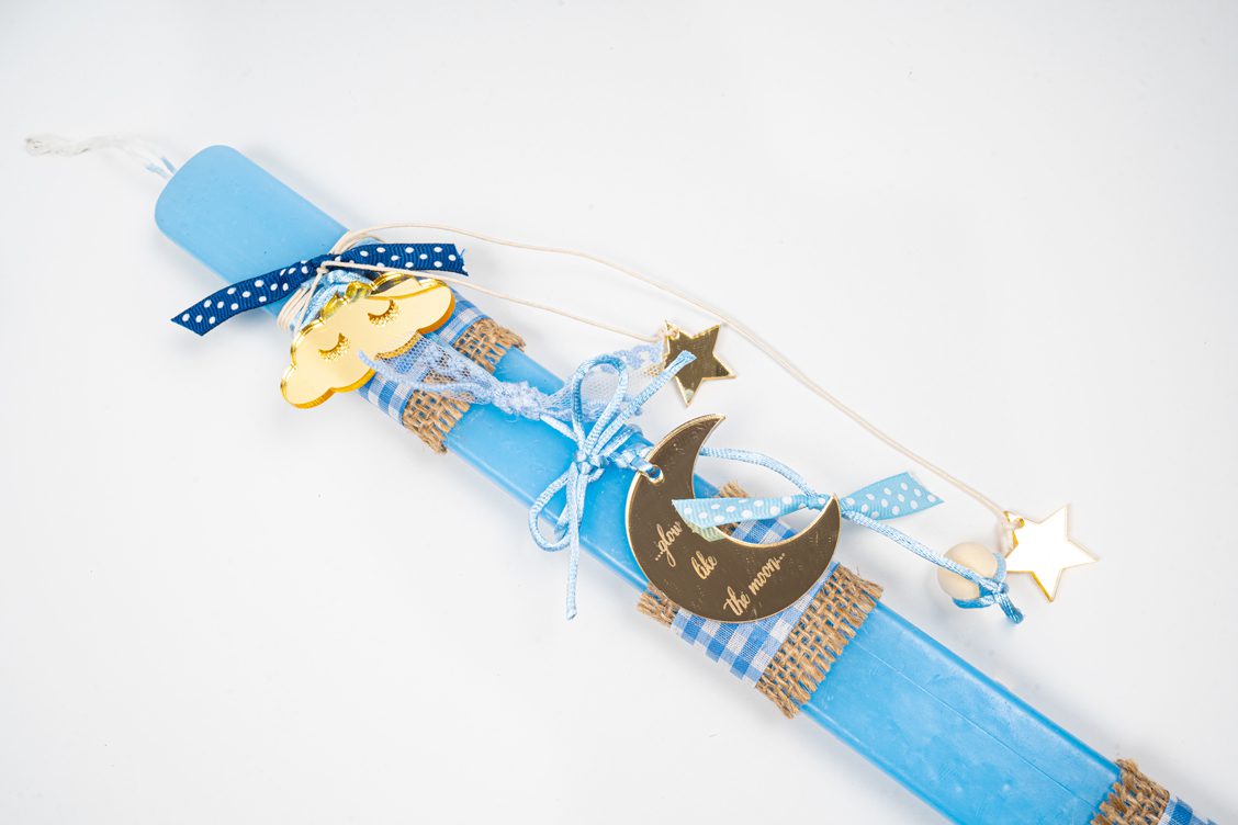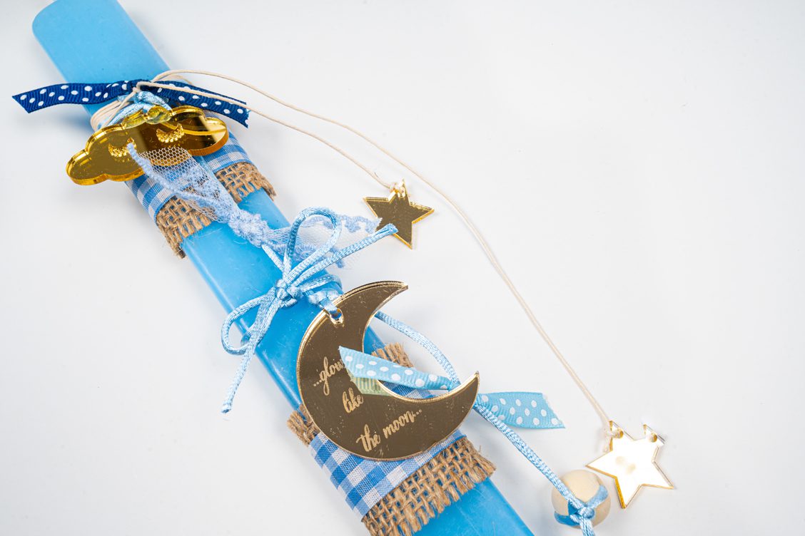 Η λαμπάδα είναι σε μπλέ απόχρωση, ντυμένη με κορδέλα λινάτσα και κορδέλες σε καρώ, λευκές και σιέλ αποχρώσεις, καθώς και λεπτομέρειες από άλλες κορδέλες όπως δαντέλα ή πουά σε σιελ αποχρώσεις. Η συγκεκριμένη λαμπάδα φέρει εκκρεμές συννεφάκι, αστεράκια και φεγγαράκι που γράφει glow like the moon, όλα από χρυσό plexiglass