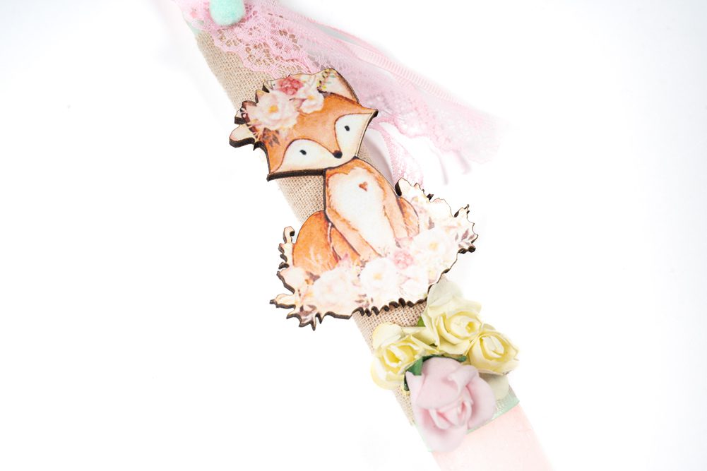 Η λαμπάδα είναι στολισμένη με ένα υπέροχο ξύλινο διακοσμητικό με boho αλεπουδίτσα στα 7 εκ. με έγχρωμη εκτύπωση