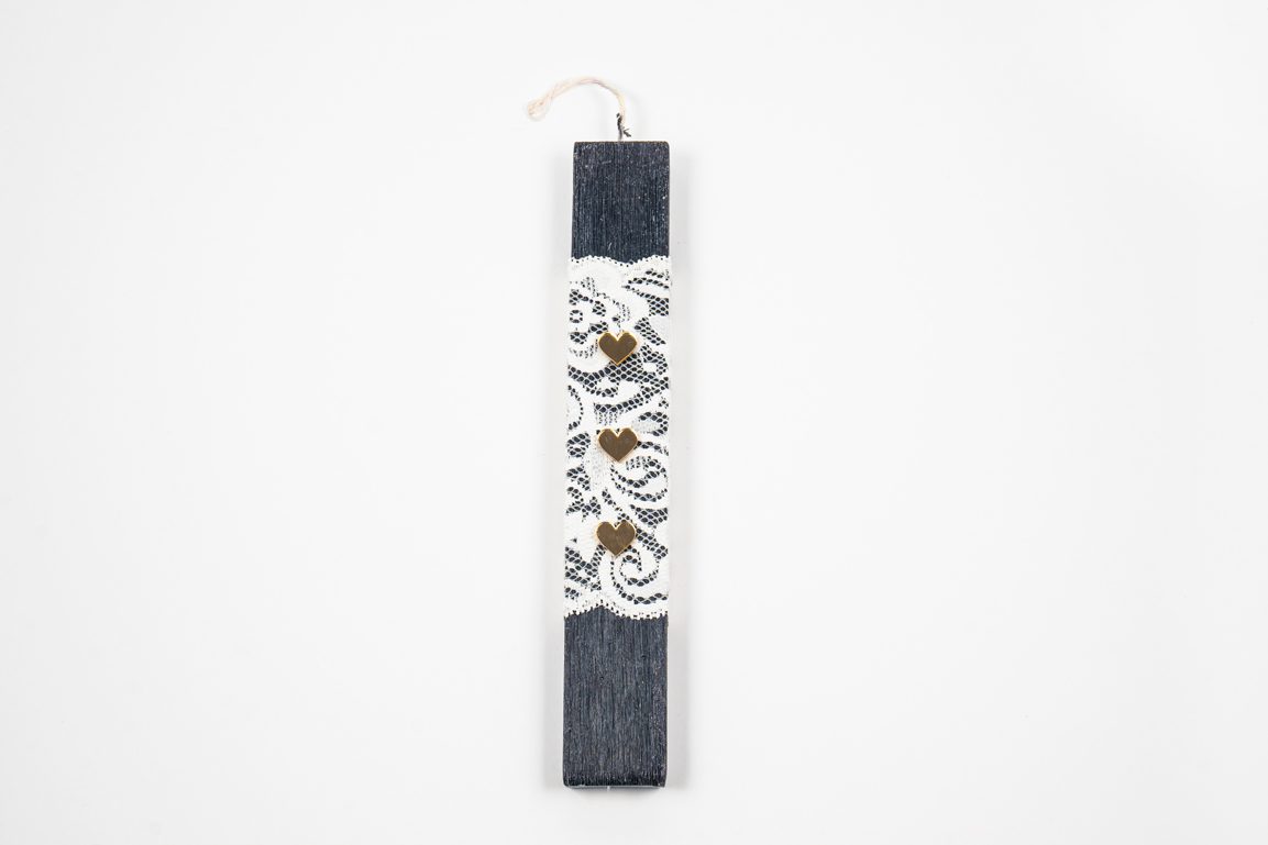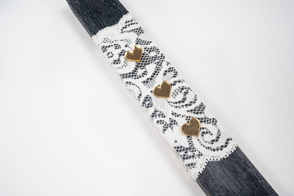 Η λαμπάδα είναι σε μαύρη απόχρωση, ντυμένη με εκρού δαντέλα ύφασμα και έχει σαν διακοσμητικά 3 μικρές καρδούλες από χρυσό plexiglass