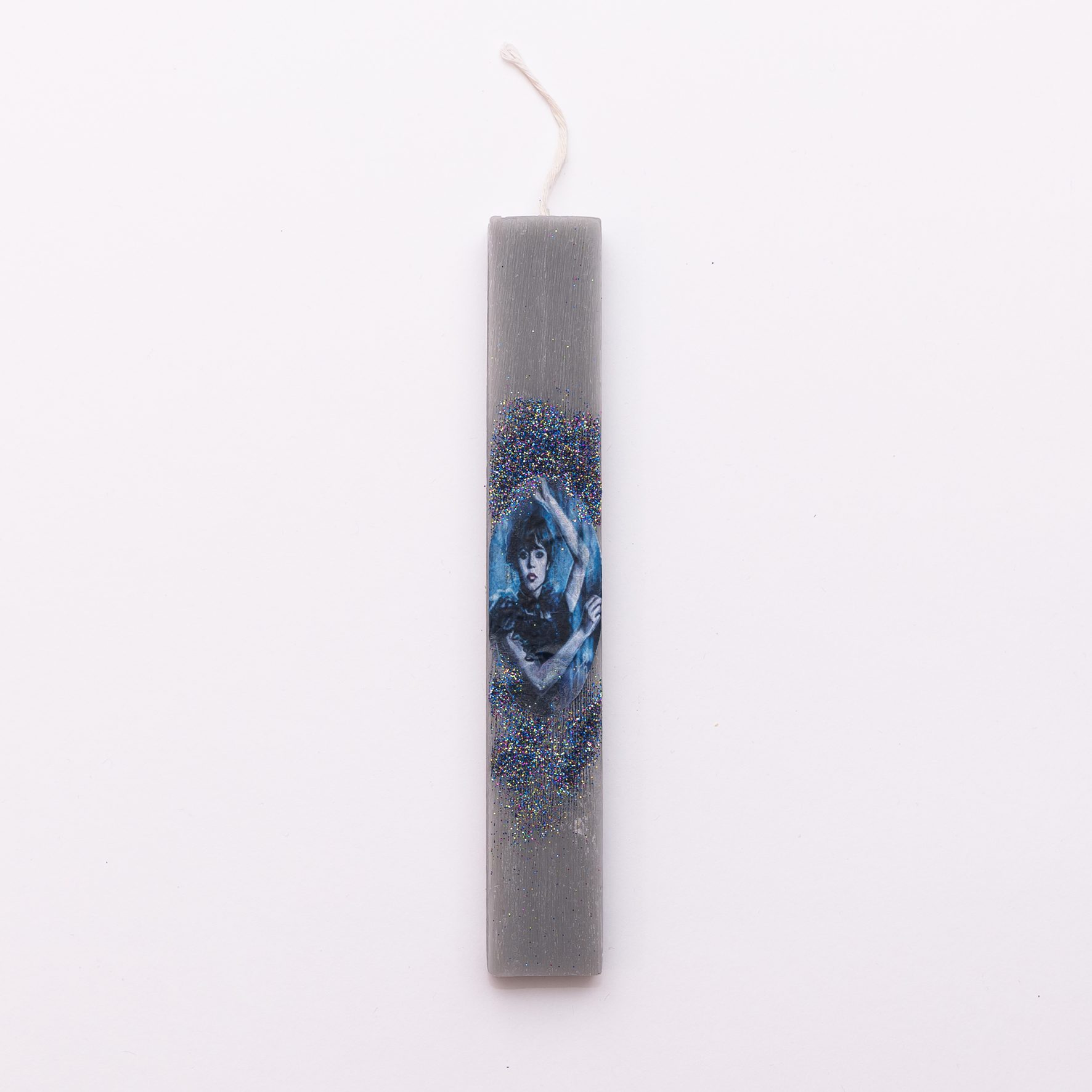 Πασχαλινή πλακέ λαμπάδα σε γκρι χρώμα αρωματική ξυστή με σχέδιο το παράξενο και λίγο σκοτεινό κορίτσι