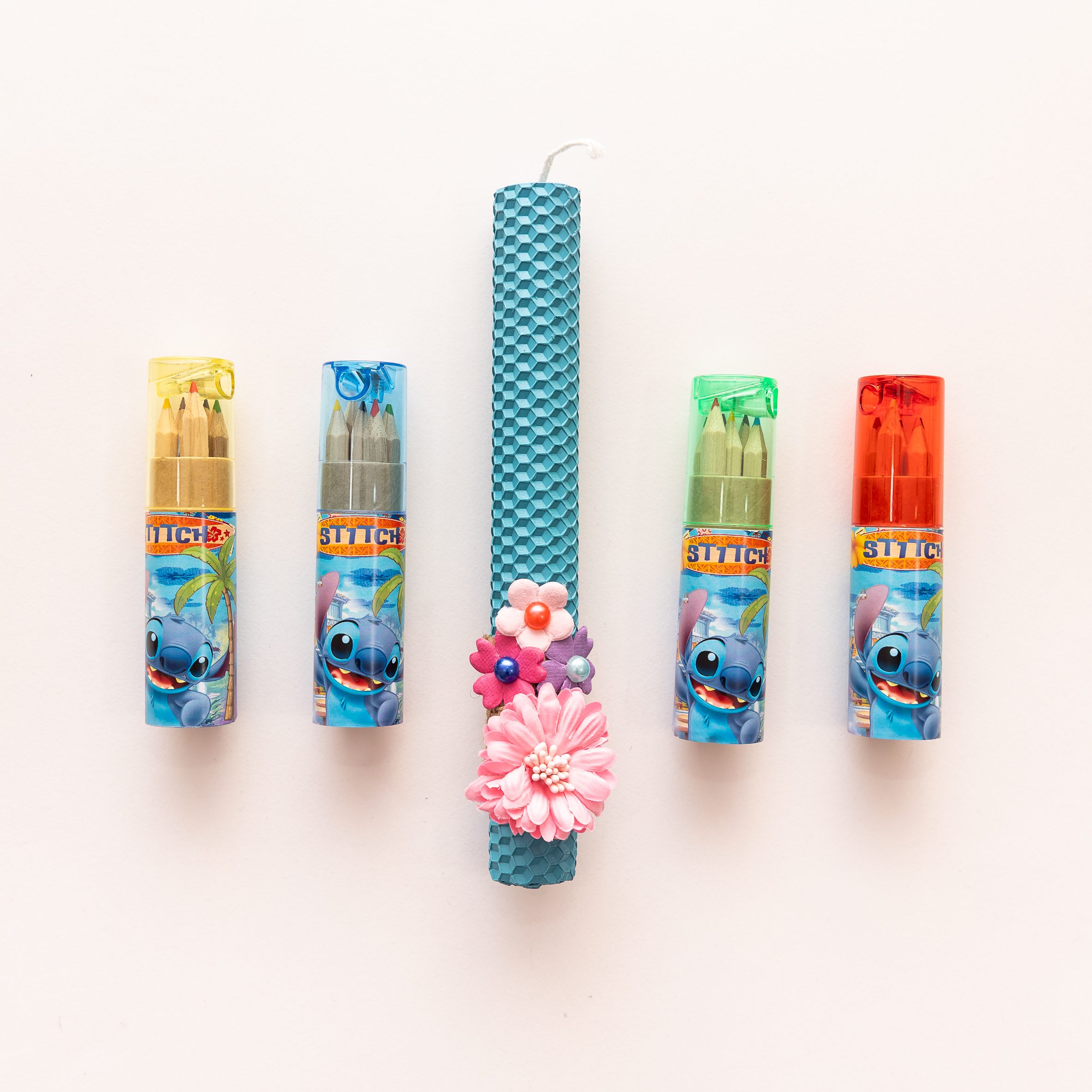 Πασχαλινή λαμπάδα φυσικό μελισσοκέρι με το μπλέ πλασματάκι ξυλομπογιές και ένα δώρο έκπληξη