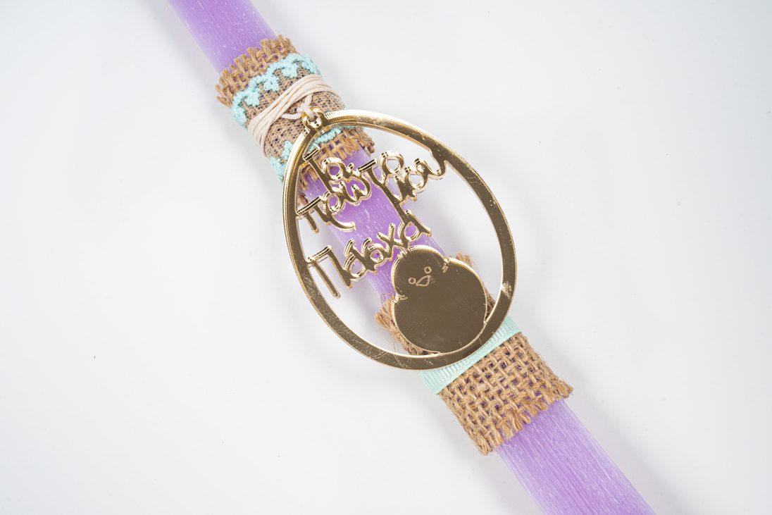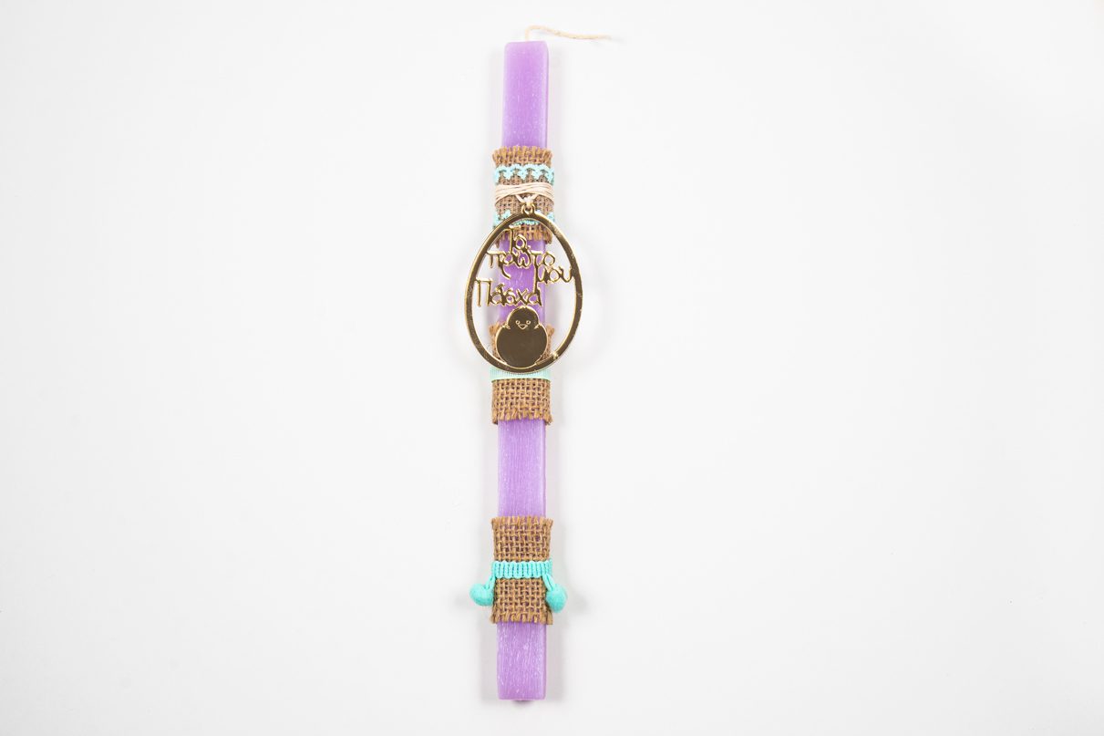 Η λαμπάδα είναι μωβ λιλά και είναι διακοσμημένη με κορδέλα λινάτσα που ξεφτίζει ώστε να δίνει την αίσθηση του “παλιακού”. Οι υπόλοιπες κορδέλες είναι σε βεραμάν αποχρώσεις καθώς και βεραμάν τρέσα πομ πομ. Η λαμπάδα διαθέτει διακοσμητικό χρυσό plexiglass αυγό με κοτοπουλάκι που γράφει “Το πρώτο μου Πασχα”