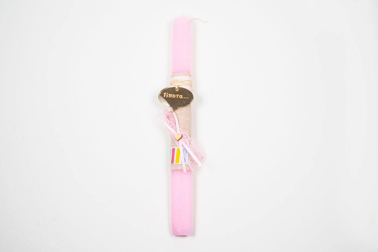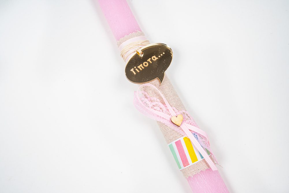 Η ροζ λαμπάδα είναι διακοσμημένη επίσης με ύφασμα σε φυσικές αποχρώσεις και διάφορες κορδέλες. Η λαμπάδα διαθέτει διακοσμητικό χρυσό plexiglass που απαντάει “-Τίποτα!”