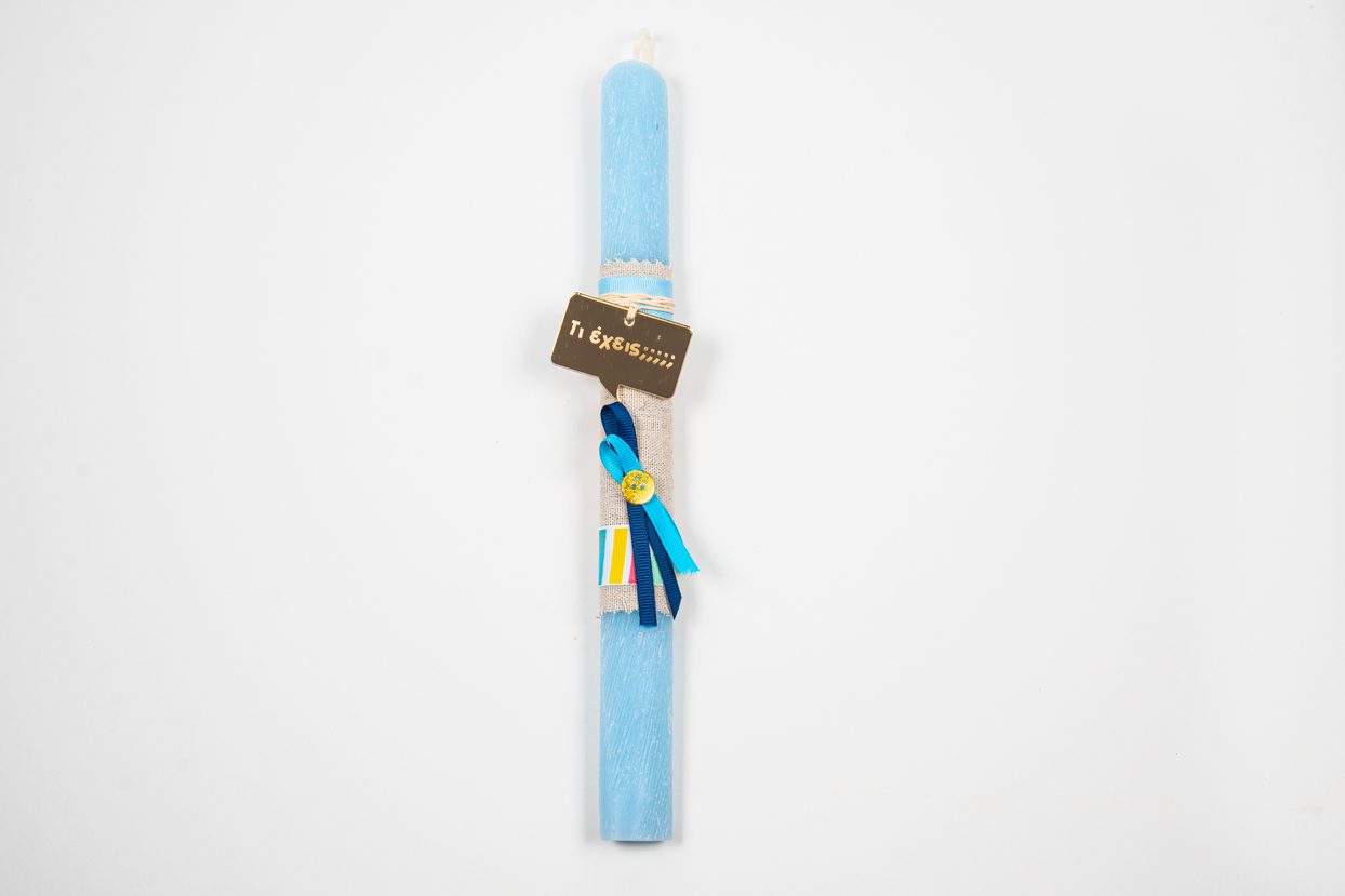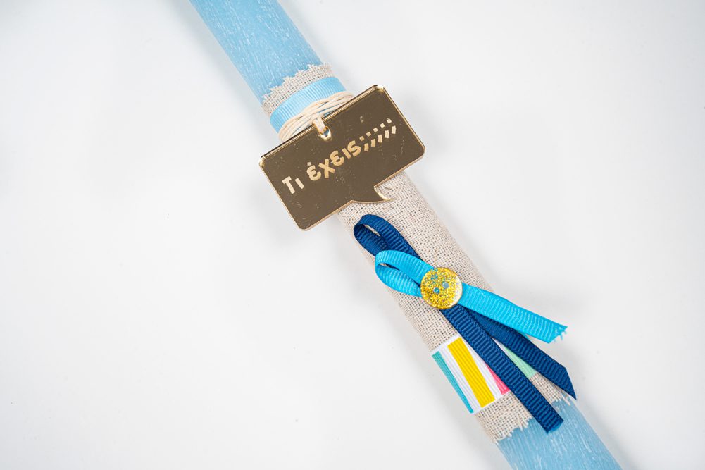 Η σιελ λαμπάδα είναι διακοσμημένη με ύφασμα σε φυσικές αποχρώσεις και διάφορες κορδέλες σε μπλέ αποχρώσεις. Η λαμπάδα διαθέτει διακοσμητικό χρυσό plexiglass που ρωτάει “-Τι έχεις?”